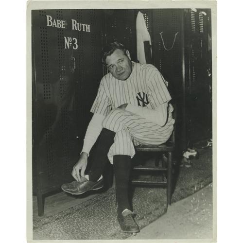 <B>1948 Babe Ruth Culver Service Photograph, Type 1.</B></I> A dying Babe sits in the Yankee Stadium locker room the day of his final appearance there. Typical edge and corner wear, leaving the image area free of flaws. Stamping on verso credits the image to "Culver Pictures, Inc." 8x10". Confirmed as "Type 1" by PSA/DNA. CGC grade: Good.