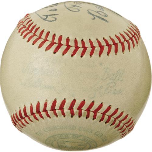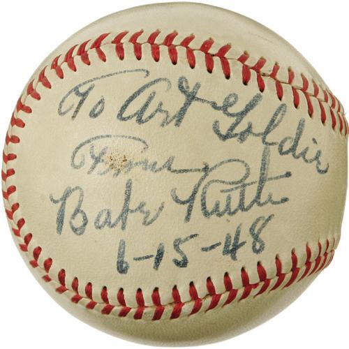 <B>1948 Babe Ruth Single Signed Baseball.</B></I> High-grade single dates from just two months before the Babe lost his battle to cancer, though the bold blue fountain pen inscription is rendered with a firm and steady hand. He inscribes the OAL (Harridge) ball to a friend, penning "To Art Goldie, From Babe Ruth, 6-15-48." The ball itself remains in similarly fine condition, toned an even, creamy shade. Certainly one of the cleanest solo Ruth balls to reach the auction block in recent memory, and one that would bring $50,000 or more if unpersonalized. <I>LOA from PSA/DNA. LOA from James Spence Authentication.</B></I><BR><BR><b>Shipping:</b> Balls, etc. (<a target="_blank" href="http://www.heritageauctions.com/common/shipping.php">view shipping information</a>)