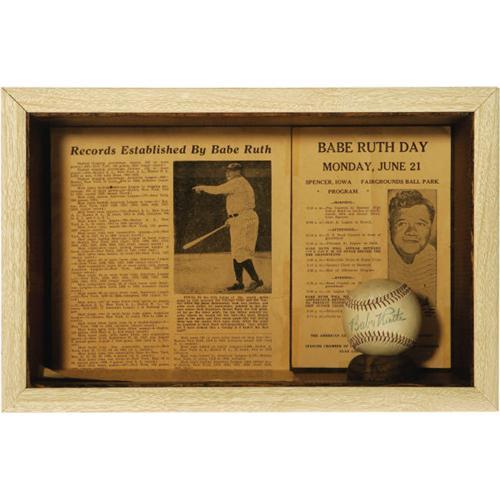 <B>1948 Babe Ruth Single Signed Baseball.</B></I>  The consignor's notarized letter of provenance is so charming, we'll let it do the talking: "June 21, 1948 was Babe Ruth Day in Spencer, Iowa.  I was twelve years old.  My Dad and a friend of his took myself, my older brother and a friend to the event.  We stopped on the way at a hardware store and Dad bought three baseballs, for twenty-nine cents each, for us three boys to have the Babe sign.  We were in the stands, at the park, when an announcement was made that the Babe was very ill and on his way to the nearby Mayo Clinic in Minnesota and would not be signing any autographs.  The three of us, with the baseballs in our pockets, crawled down the back of the grandstand and went to the driveway leading to the parking lot.  The Babe's car finally arrived.  We stood, with our arms clasped, in the middle of the road.  Babe was in the front passenger seat and his secretary was in the back.  The secretary hollered 'Get out of the way you little brats,' but the Babe said 'Come on over here, boys,' in a deep and broken voice.  He then asked his secretary for a pen and signed my brother's ball, then our friend's, and my ball last.  What a thrill!"<BR><BR>     The result of this young boy's brash move, and that of the Babe's limitless kindness toward children, is a fantastic sweet spot signature rating a conservative 9/10 in boldness.  The ball is mounted with what appears to be glue on the lower panel into a shadow box where it is displayed with a program from that Spencer, Iowa event and a newspaper clipping noting the Babe's dozens of baseball records.  Certainly this is one of the final autographs ever signed by the dying legend, and the Babe's generosity under these circumstances speaks volumes, and reminds us why we love him so much to this day.  Notarized letter of provenance from consignor is included.  <I>LOA from PSA/DNA.</B></I> <BR><BR><B>Important notice:</B> Heritage usually auctions material at the rate of 200-250 lots per hour. On some occasions eBay Live bid software or the Internet may not be able to keep up with the pace of the auction. We recommend placing a realistic absentee bid now as insurance to avoid disappointment. Occasionally the auctioneer may eliminate or reject an eBay Live bid, and the auctioneer may also reopen a lot after the close of the eBay live bidding (usually because we missed an audience bid), and may reject your bid even if it shows you as the winning bidder. By bidding via eBay Live, you agree that Heritage may award the lot to another bidder at its sole discretion under the circumstances described above or any other reasonable circumstances. Since eBay bids are not shown to us until we open the lot on the floor, we treat those bids just like floor bids. In most cases the floor responds before the eBay bid is presented to us, due to Internet lag time, so for consistency we have made it a policy that floor bids are always considered first over tie eBay live bids. Also please note that all Heritage lots purchased through eBay Live carry a 22.5% Buyer's Premium. Please make sure you read the Terms and Conditions before you bid. This lot is being auctioned in conjunction with a live floor auction by Heritage Galleries & Auctioneers. All final auction and invoice information will be supplied by Heritage Galleries & Auctioneers, and all other information should be considered preliminary. Lot:19018 <BR><BR><B>Winning Notification and Billing:</B> After the FINAL session in this auction is complete, Heritage will send e-mail and snail mail invoices. This process normally takes several days. All final auction and invoice information will be supplied by Heritage Galleries & Auctioneers, and all other information should be considered preliminary.  <BR><BR>This auction will be conducted on a live auction floor and over the Internet through eBay Live. If you choose to place an absentee bid, please take a moment to <font color='#0000ff'><u><a href='http://pages.ebay.com/liveauctions/help/before/laabsentee.html'>learn how eBay Live absentee bidding works</a></u></font><font color='#000000'>
