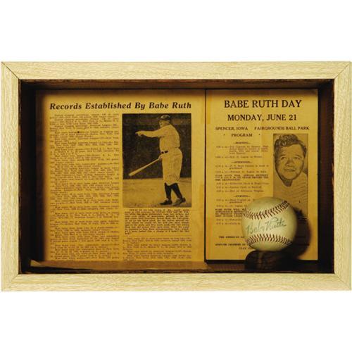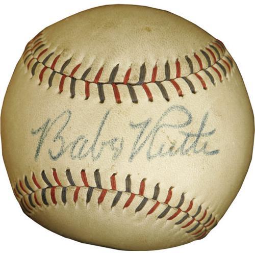 <B>1948 Babe Ruth Single Signed Baseball.</B></I> The consignor's notarized letter of provenance is so charming, we'll let it do the talking: "June 21, 1948 was Babe Ruth Day in Spencer, Iowa. I was twelve years old. My Dad and a friend of his took myself, my older brother and a friend to the event. We stopped on the way at a hardware store and Dad bought three baseballs, for twenty-nine cents each, for us three boys to have the Babe sign. We were in the stands, at the park, when an announcement was made that the Babe was very ill and on his way to the nearby Mayo Clinic in Minnesota and would not be signing any autographs. The three of us, with the baseballs in our pockets, crawled down the back of the grandstand and went to the driveway leading to the parking lot. The Babe's car finally arrived. We stood, with our arms clasped, in the middle of the road. Babe was in the front passenger seat and his secretary was in the back. The secretary hollered 'Get out of the way you little brats,' but the Babe said 'Come on over here, boys,' in a deep and broken voice. He then asked his secretary for a pen and signed my brother's ball, then our friend's, and my ball last. What a thrill!"<BR><BR> The result of this young boy's brash move, and that of the Babe's limitless kindness toward children, is a fantastic sweet spot signature rating a conservative 9/10 in boldness. The ball is mounted with what appears to be glue on the lower panel into a shadow box where it is displayed with a program from that Spencer, Iowa event and a newspaper clipping noting the Babe's dozens of baseball records. Certainly this is one of the final autographs ever signed by the dying legend, and the Babe's generosity under these circumstances speaks volumes, and reminds us why we love him so much to this day. Notarized letter of provenance from consignor is included. <I>LOA from PSA/DNA.</B></I>