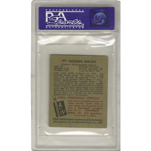 <B>1948 Bowman George Mikan #69 PSA EX 5.</B></I> A new chapter for the role of center was penned by this Hall of Fame legend, and there isn't a big man in the NBA who doesn't owe Mikan a debt of gratitude. He is appropriately remembered by this high quality cardboard from the first great basketball issue, appearing in perfect color and registration. Other than typical corner wear, there's not a problem worth noting here.<BR><BR><b>Shipping:</b> Sportscard (<a target="_blank" href="http://www.heritageauctions.com/common/shipping.php">view shipping information</a>)