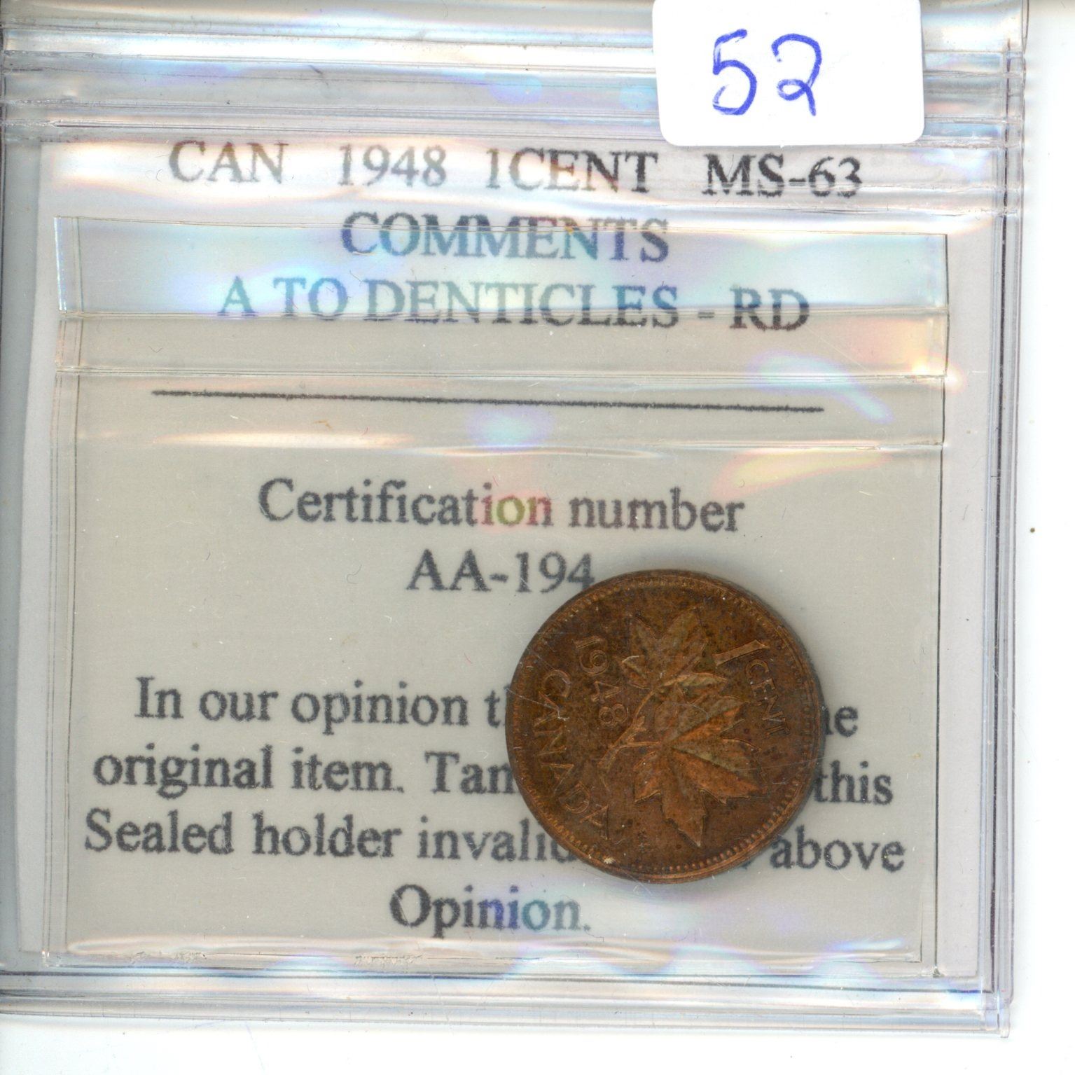 1948 Canada 1¢; MS-63 A to Denticles RD (PPGS # AA-194)