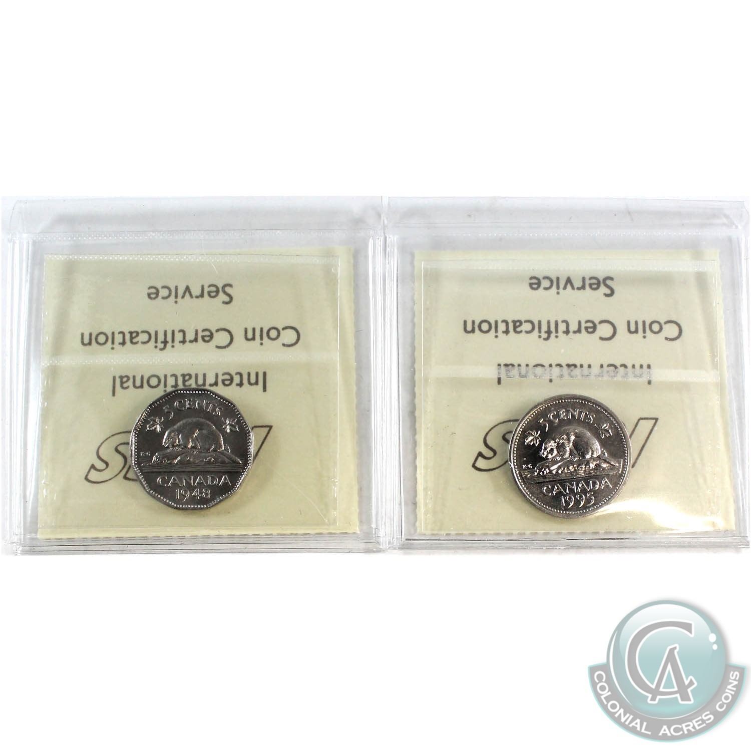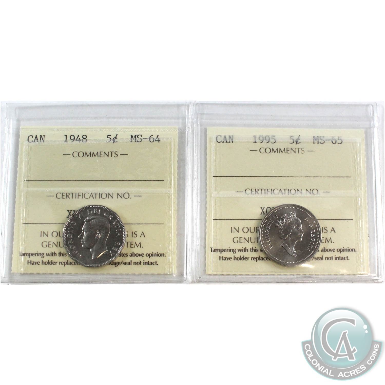 1948 Canada 5-cent MS-64 & 1995 Canada 5-cent MS-65. Both coins have been certified by ICCS. 2pcs.