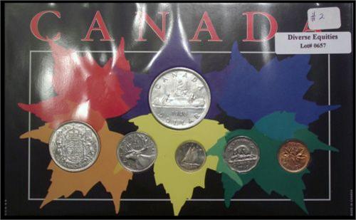 Silver dollar -EF45; 50 cent is MS60 with bag marks in the left obverse field; 25 cent-EF; 10 cent-AU; 5 cent-VF and 1 cent-MS63 mostly red. The silver coins are brilliant except for the dime which has light reverse tone.