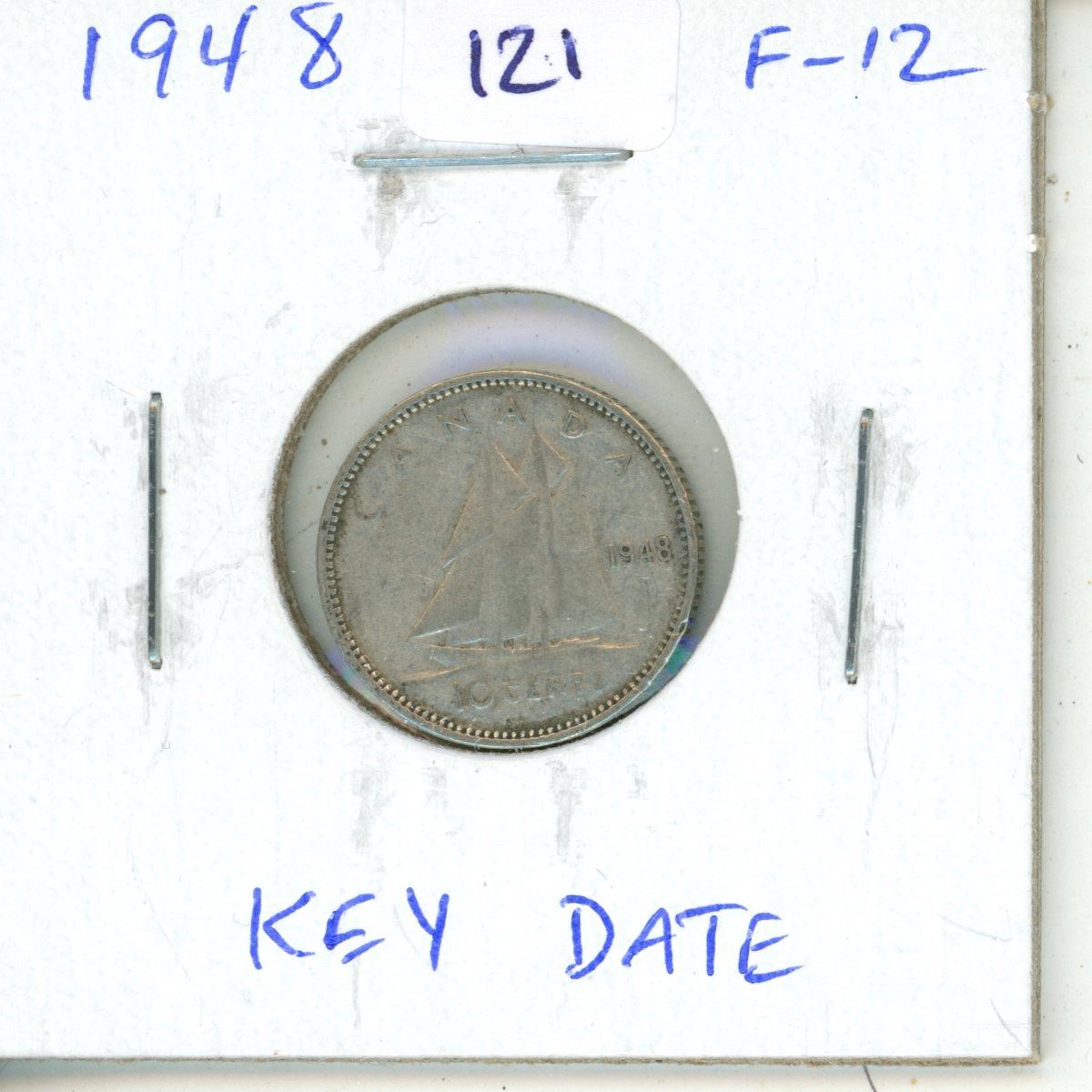 1948 Canadian Silver 10 Cents. F-12. Key Date.