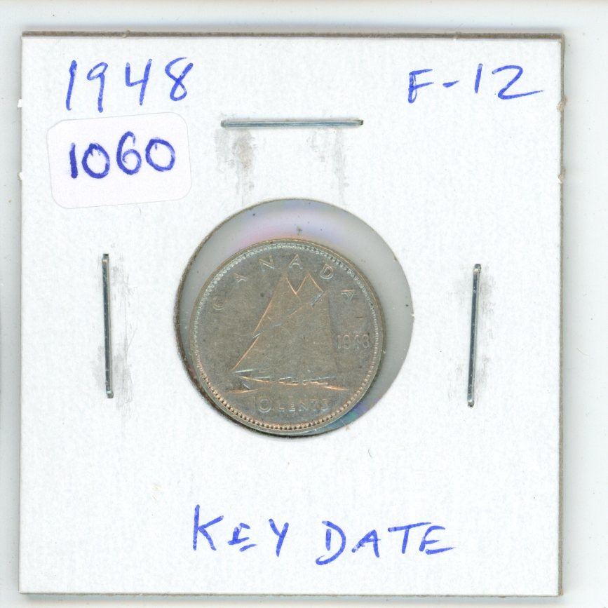 1948 Canadian Silver 10 Cents. Key Date. F-12.
