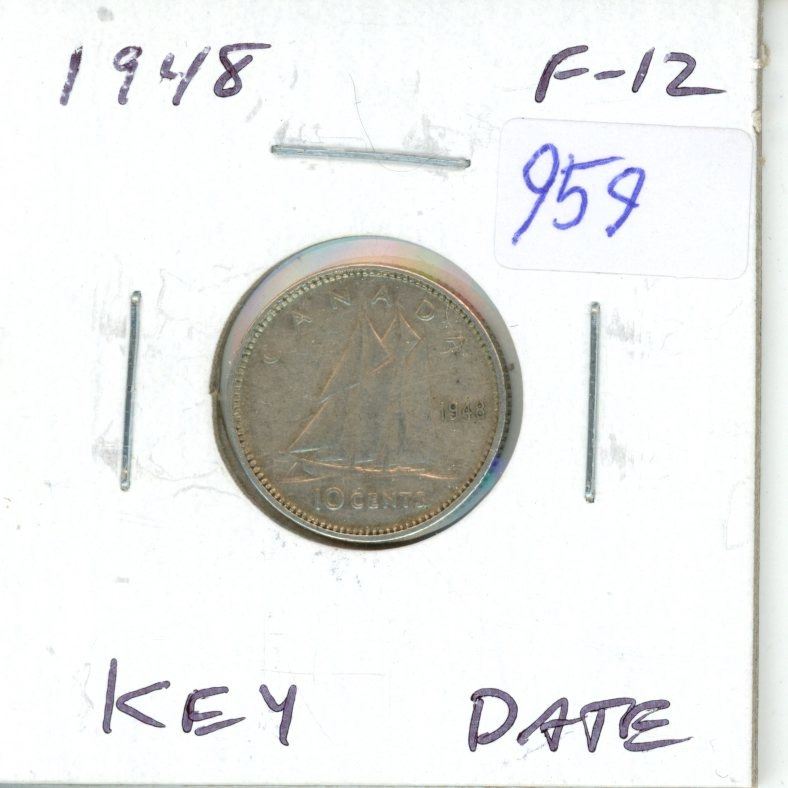 1948 Canadian Silver 10 Cents. Key Date. F-12.