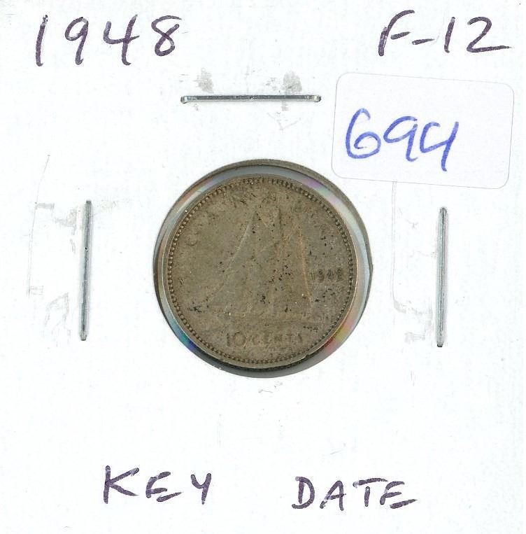 1948 Canadian Silver 10 Cents. Key Date. F-12.