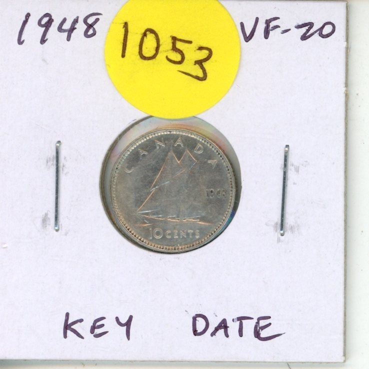 1948 Canadian Silver 10 Cents. Key Date. VF-20.