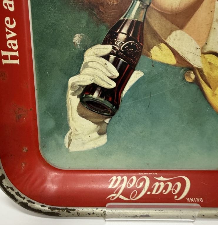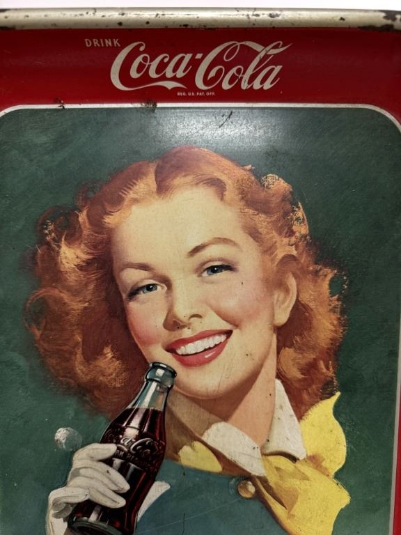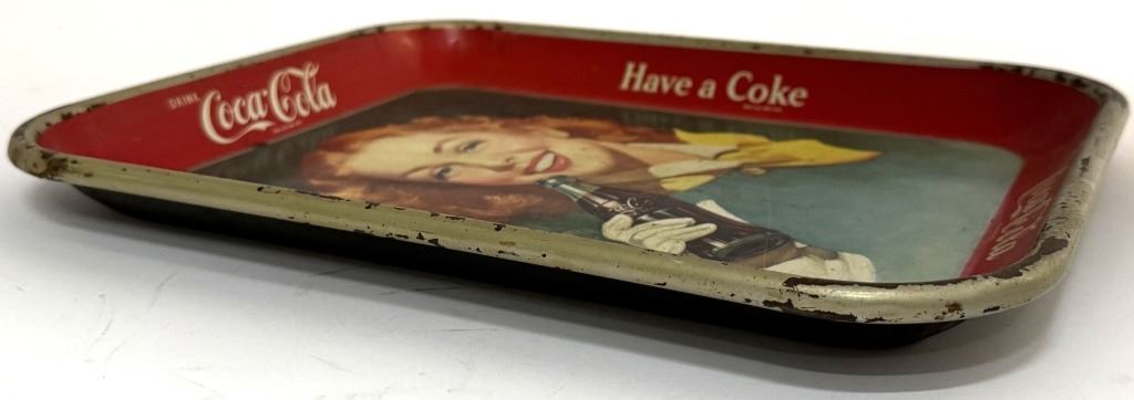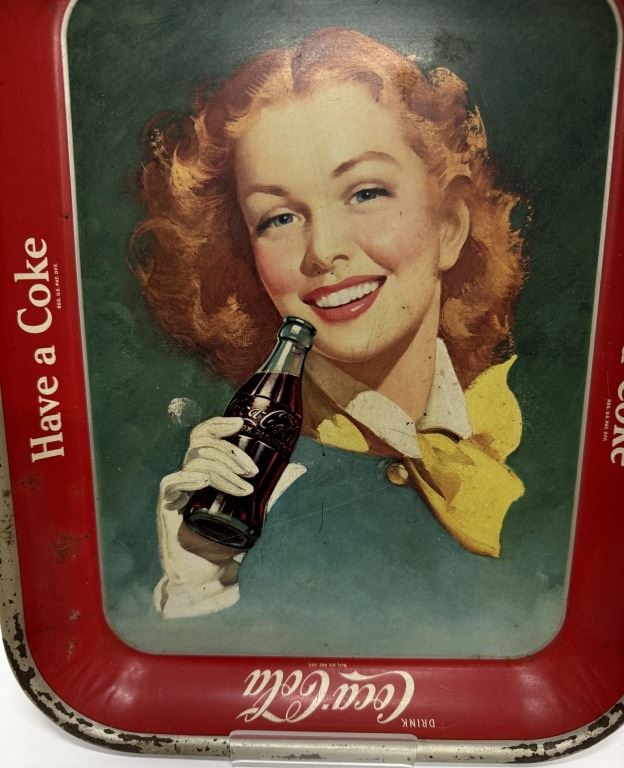 Item/Description: Featuring a vintage 1948 Coca-Cola "Have a Coke" soda advertisement serving tray featuring a red hair smiling woman.