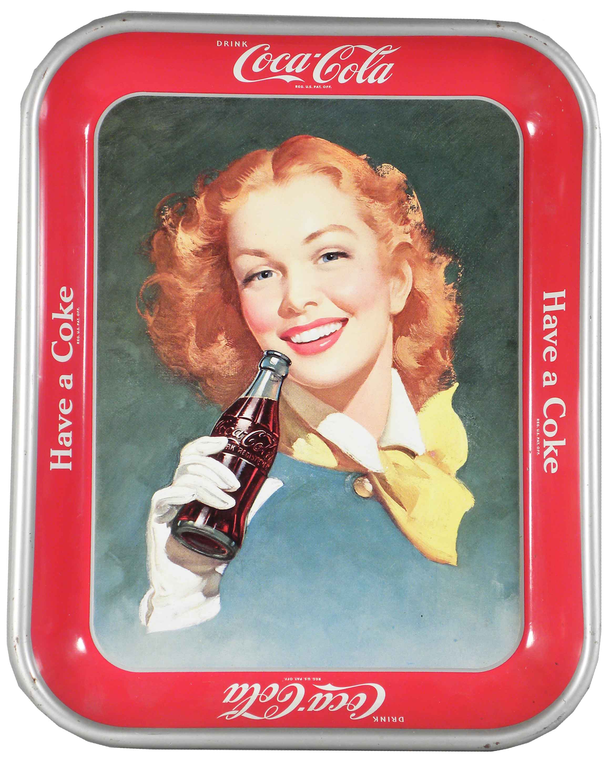 1948 Coca Cola Tin Serving Tray. One of 2 versions done in 1948 this one is screened background. Very slight edge ware otherwise near mint condition. 10 1/2 X 13 inches.