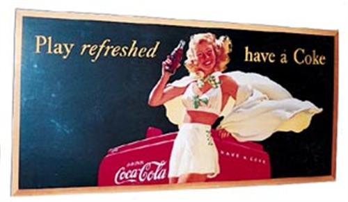 Great graphics. 27"x56". Beautiful colors, strong cond. 1 very faint stain noted at the top of her head in the hair as well as on the "c" of coca on the cooler, but very faint. As well as a few faint border stains light edge and border wear and marks. Cond. 8.5-8.8 but displays closer to 9.5.