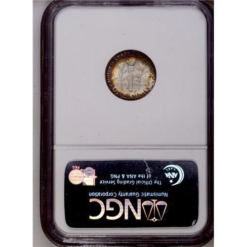 <B>1948-D<10C> MS68 <img border='0' src='http://www.heritagecoins.com/images/star.gif' width=10 height=10> NGC.</B></I> Vivid sea-green, gold, and rose-red colors encompass the cream-gray centers. A suitably struck and undisturbed Superb Gem. Census: 2 in 68 <img border='0' src='http://www.heritagecoins.com/images/star.gif' width=10 height=10>, 1 finer as MS68 Full Torch <img border='0' src='http://www.heritagecoins.com/images/star.gif' width=10 height=10> (5/06).