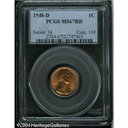 1948-D 1C MS67 Red PCGS. This pumpkin-orange Super <B>1948-D 1C MS67 Red PCGS.</B></I> This pumpkin-orange Superb Gem displays booming cartwheel luster and an intricate strike. A nicely preserved example of this conditionally elusive issue. Population: 33 in 67, none finer (11/04). <BR><BR><B>Important notice:</B> Heritage usually auctions material at the rate of 200-250 lots per hour. On some occasions eBay Live bid software or the Internet may not be able to keep up with the pace of the auction. We recommend placing a realistic absentee bid now as insurance to avoid disappointment. Occasionally the auctioneer may eliminate or reject an eBay Live bid, and the auctioneer may also reopen a lot after the close of the eBay live bidding (usually because we missed an audience bid), and may reject your bid even if it shows you as the winning bidder. By bidding via eBay Live, you agree that Heritage may award the lot to another bidder at its sole discretion under the circumstances described above or any other reasonable circumstances. Since eBay bids are not shown to us until we open the lot on the floor, we treat those bids just like floor bids. In most cases the floor responds before the eBay bid is presented to us, due to Internet lag time, so for consistency we have made it a policy that floor bids are always considered first over tie eBay live bids. Also please note that all Heritage lots purchased through eBay Live carry a 20% Buyer's Premium. Please make sure you read the Terms and Conditions before you bid. This lot is being auctioned in conjunction with a live floor auction by Heritage Galleries & Auctioneers. All final auction and invoice information will be supplied by Heritage Galleries & Auctioneers, and all other information should be considered preliminary. Lot:5369