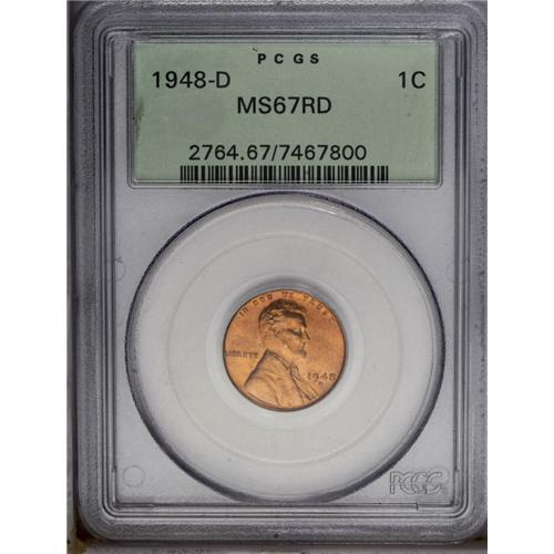 <B>1948-D<1C> MS67 Red PCGS.</B></I> This pumpkin-orange Superb Gem displays booming cartwheel luster and an intricate strike. A nicely preserved example of this conditionally elusive issue. Population: 39 in 67, 0 finer (3/06).<BR><I>From The Kendall Marie #4 All-Time Finest PCGS Registry of Lincoln Cents with Varieties, Circulation Strikes, 1909-1958.</B></I> <BR><BR><B>Important notice:</B> Heritage usually auctions material at the rate of 200-250 lots per hour. On some occasions eBay Live bid software or the Internet may not be able to keep up with the pace of the auction. We recommend placing a realistic absentee bid now as insurance to avoid disappointment. Occasionally the auctioneer may eliminate or reject an eBay Live bid, and the auctioneer may also reopen a lot after the close of the eBay live bidding (usually because we missed an audience bid), and may reject your bid even if it shows you as the winning bidder. By bidding via eBay Live, you agree that Heritage may award the lot to another bidder at its sole discretion under the circumstances described above or any other reasonable circumstances. Since eBay bids are not shown to us until we open the lot on the floor, we treat those bids just like floor bids. In most cases the floor responds before the eBay bid is presented to us, due to Internet lag time, so for consistency we have made it a policy that floor bids are always considered first over tie eBay live bids. Also please note that all Heritage lots purchased through eBay Live carry a 20% Buyer's Premium. Please make sure you read the Terms and Conditions before you bid. This lot is being auctioned in conjunction with a live floor auction by Heritage Galleries & Auctioneers. All final auction and invoice information will be supplied by Heritage Galleries & Auctioneers, and all other information should be considered preliminary. Lot:569 <BR><BR><B>Winning Notification and Billing:</B> After the FINAL session in this auction is complete, Heritage will send e-mail and snail mail invoices. This process normally takes several days. All final auction and invoice information will be supplied by Heritage Galleries & Auctioneers, and all other information should be considered preliminary. <BR><BR>This auction will be conducted on a live auction floor and over the Internet through eBay Live. If you choose to place an absentee bid, please take a moment to <font color='#0000ff'><u><a href='http://pages.ebay.com/liveauctions/help/before/laabsentee.html'>learn how eBay Live absentee bidding works</a></u></font><font color='#000000'>