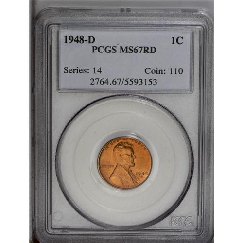 <B>1948-D<1C> MS67 Red PCGS.</B></I> Well struck and highly lustrous, with bright orange-red surfaces that are radiant and near-pristine. A couple of tiny ticks are seen on the reverse. Population: 39 in 67, 0 finer (7/06).<BR><I>From The Tigard Oregon Small Cent Collection.</B></I>