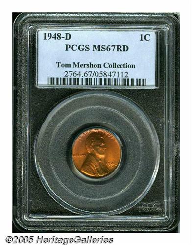 <B>1948-D<1C> MS67 Red PCGS.</B></I> Well struck with bright luster and vivid crimson-red coloration. The beautifully preserved surfaces are blemish-free and almost entirely devoid of carbon. Population: 38 in 67, 0 finer (3/05).<BR><I>From The Tom Mershon #2 All-Time PCGS Registry Set of Lincoln Wheat Cents.</B></I>