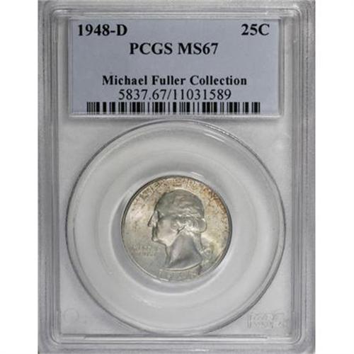 <B>1948-D 25C MS67 PCGS.</B></I> Bright and highly lustrous, with bold design features and blemish-free surfaces. A slight degree of speckled olive and russet patina appears on both sides. Population: 23 in 67, 0 finer (10/07).<BR><I>From The Michael Fuller Collection.</B></I><BR><BR><B>Coin Engraver:</B> John Flanagan<BR><BR><b>Shipping:</b> Coins & Currency (<a target="_blank" href="http://www.heritageauctions.com/common/shipping.php">view shipping information</a>)
