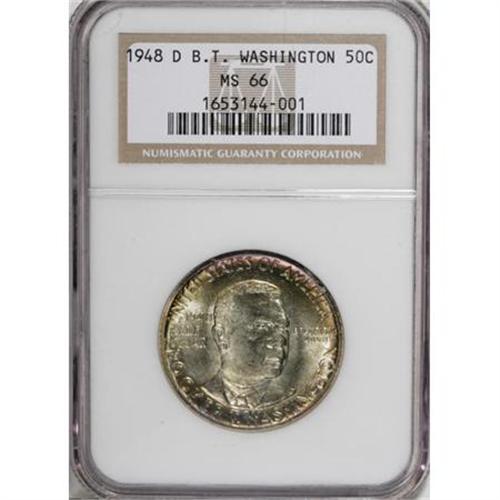 <B>1948-D 50C Booker T. Washington MS66 NGC.</B></I> NGC Census: (181/13). PCGS Population (155/5). Mintage: 8,005. Numismedia Wsl. Price for NGC/PCGS coin in MS66: $260. (#9413)<BR><BR><b>Shipping:</b> Coins & Currency (<a target="_blank" href="http://www.heritageauctions.com/common/shipping.php">view shipping information</a>)