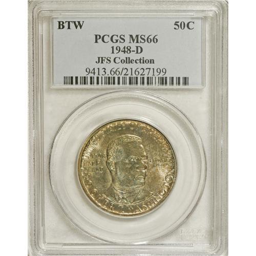 <B>1948-D 50C Booker T. Washington MS66 PCGS.</B></I> Ex: JFS Collection. Vivid golden-tan and cobalt-blue patina enriches this shimmering and sharply struck half. While most examples exhibit roughness on Washington's jaw, the present piece is surprisingly clean in that area. PCGS has certified just five coins finer (4/07).<BR><I>From The Cary & Cheryl Porter Collection.</B></I><BR><BR><b>Shipping:</b> Coins & Currency (<a target="_blank" href="http://www.heritageauctions.com/common/shipping.php">view shipping information</a>)