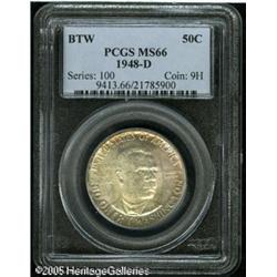 <B>1948-D 50C Booker T. Washington MS66 PCGS.</B></I> Variegated golden-brown, powder-blue, and mauve toning visits lustrous surfaces that are seemingly devoid of mentionable marks. Sharp impressions are seen on the design elements. Lot:8612
