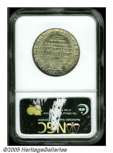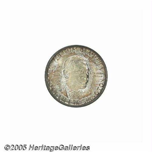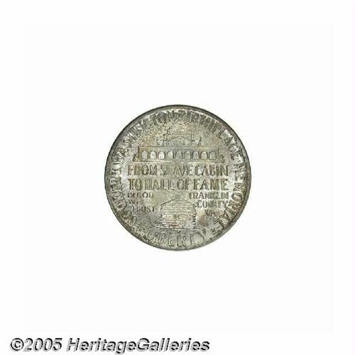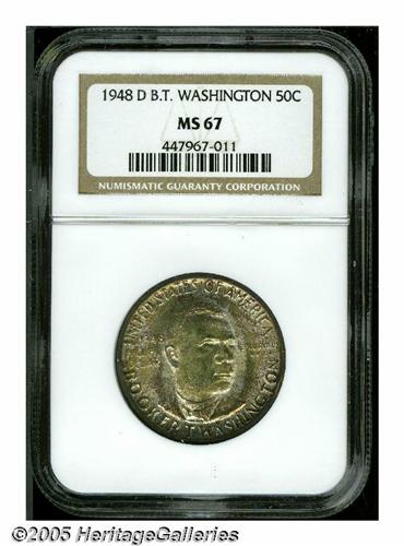 <B>1948-D<50C> Booker T. Washington MS67 NGC.</B></I> According to Swiatek and Breen, this commemorative half dollar was struck to perpetuate the ideals and teachings of Booker T. Washington, and to purchase, construct and maintain memorials to his memory, specifically to buy and restore the 300 acre farm with the original log cabin, which is part of the reverse design. The Superb Gem offered here displays dazzling luster, freckled gold, lavender, and lime-green toning, and sharply struck design elements. The surfaces are impeccably well preserved. Population: 13 in 67, 0 finer (6/05).