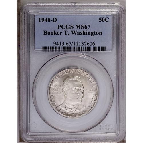 <B>1948-D<50C> Booker T. Washington MS67 PCGS.</B></I> Fully struck with glowing satin luster and even smoky-gray toning, augmented at the borders by trace amounts of speckled patina. Exquisitely preserved, with a few tiny blemishes on each side that are barely noticed even under magnification. Population: 3 in 67, 0 finer (4/06).