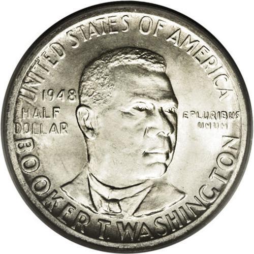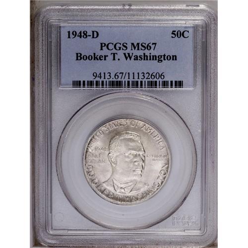 <B>1948-D<50C> Booker T. Washington MS67 PCGS.</B></I> Exquisitely struck with glowing satin luster and even smoky-gray toning, augmented at the borders by trace amounts of speckled patina. Exquisitely preserved, with a few tiny blemishes on each side that are barely noticed even under magnification. Population: 3 in 67, 0 finer (6/06).