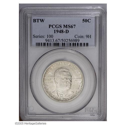 <B>1948-D<50C> Booker T. Washington MS67 PCGS.</B></I> Seldom do example of this commemorative Half Dollar type appear in Superb Gem condition. Sometimes it seems that these coins were bagmarked almost before they were struck. This example, however, has amazing, nearly flawless silver surfaces. It is fully brilliant on both sides. Population: 2 in 67, 0 finer (10/05).