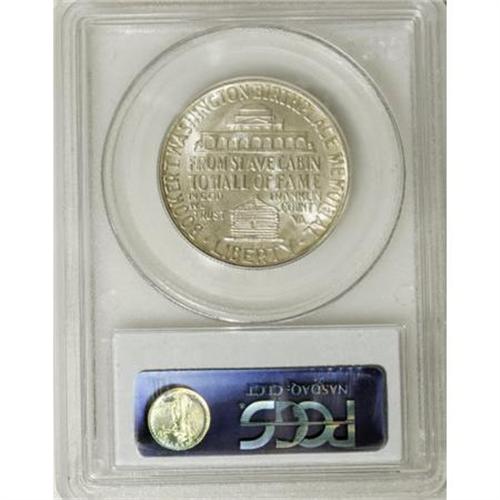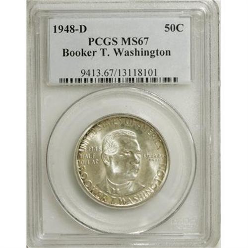 <B>1948-D 50C Booker T. Washington MS67 PCGS.</B></I> This Superb Gem coin is mostly silver-white, with just a dab of smoky gray patina at the obverse rim, while the reverse is largely untoned. The 1948-D had a typical emission for a mintmarked piece from this series of 8,005 pieces, but the present example is one of only five so graded at PCGS, with none finer at either service (6/07).<BR><BR><b>Shipping:</b> Coins & Currency (<a target="_blank" href="http://www.heritageauctions.com/common/shipping.php">view shipping information</a>)