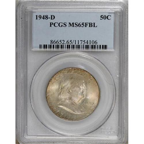 <B>1948-D 50C MS65 Full Bell Lines PCGS.</B></I> PCGS Population (1148/105). NGC Census: (457/10). Numismedia Wsl. Price for NGC/PCGS coin in MS65: $112. (#86652)<BR><BR><b>Shipping:</b> Coins & Currency (<a target="_blank" href="http://www.heritageauctions.com/common/shipping.php">view shipping information</a>)