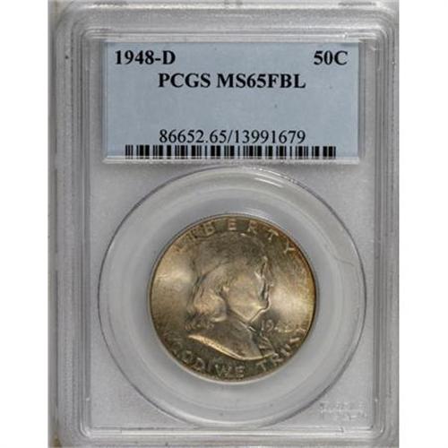 <B>1948-D 50C MS65 Full Bell Lines PCGS.</B></I> PCGS Population (1163/105). NGC Census: (456/10). Numismedia Wsl. Price for NGC/PCGS coin in MS65: $112. (#86652)<BR><BR><b>Shipping:</b> Coins & Currency (<a target="_blank" href="http://www.heritageauctions.com/common/shipping.php">view shipping information</a>)
