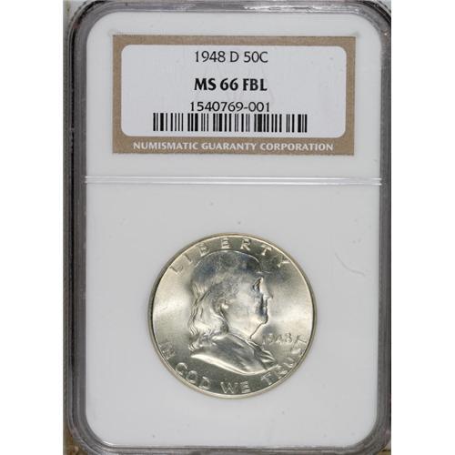 <B>1948-D 50C MS66 Full Bell Lines NGC.</B></I> A sharply detailed example, and tied for the finest certified by either NGC or PCGS. This example is fully brilliant with frosty silver luster. Census: 10 in 66 Full Bell Lines, 0 finer (4/07).<BR><BR><b>Shipping:</b> Coins & Currency (<a target="_blank" href="http://www.heritageauctions.com/common/shipping.php">view shipping information</a>)