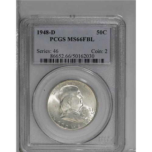 <B>1948-D<50C> MS66 Full Bell Lines PCGS.</B></I> A crisp Premium Gem with brilliant luster and excellent definition. For the Franklin half connoisseur, neither NGC nor PCGS has graded a finer example with the strike of this coin (7/06).
