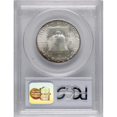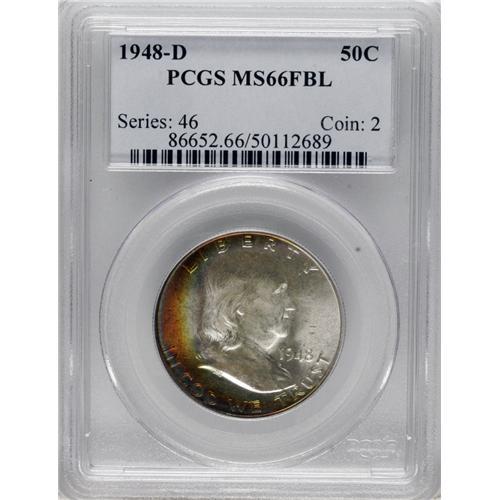 <B>1948-D 50C MS66 Full Bell Lines PCGS.</B></I> Sharply struck and well preserved, this Premium Gem is from the first year of the Franklin half dollar series. A handful of tiny marks on each side prevent an even finer grade assessment. The hallmark of this coin is really the vivid arc of olive-gold, crimson, and emerald-green iridescence that decorates the left side of the obverse.<BR><BR><b>Shipping:</b> Coins & Currency (<a target="_blank" href="http://www.heritageauctions.com/common/shipping.php">view shipping information</a>)