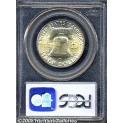 <B>1948-D 50C MS66 Full Bell Lines PCGS.</B></I> Streaks of apricot and sky-blue color endow this highly lustrous premium Gem. This first year Franklin Half has a small mark on the post but is otherwise nearly pristine.