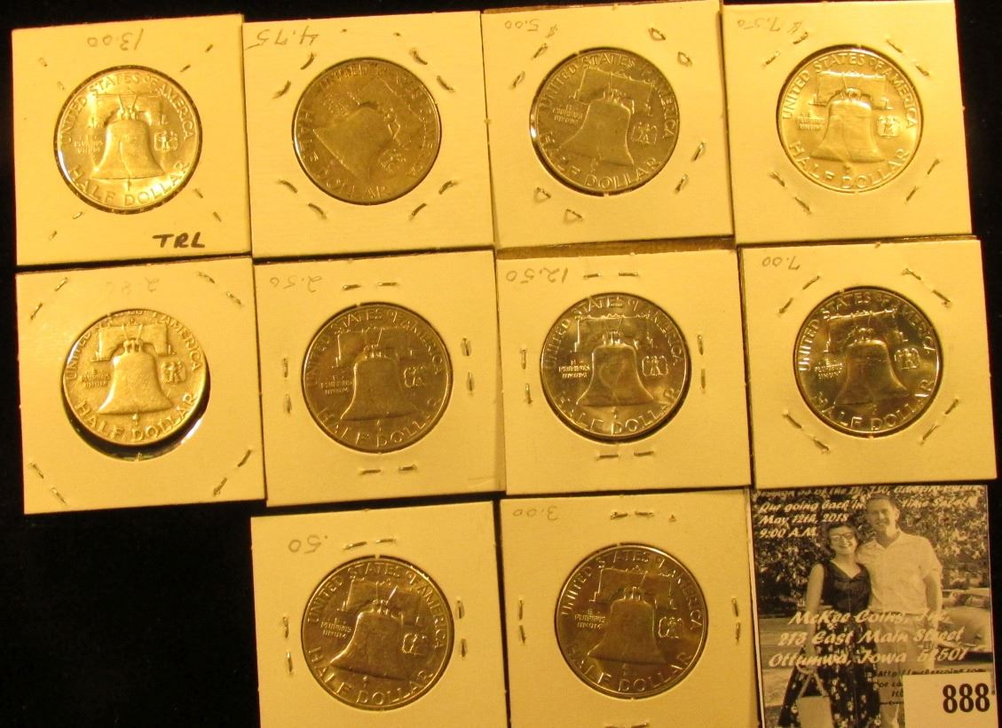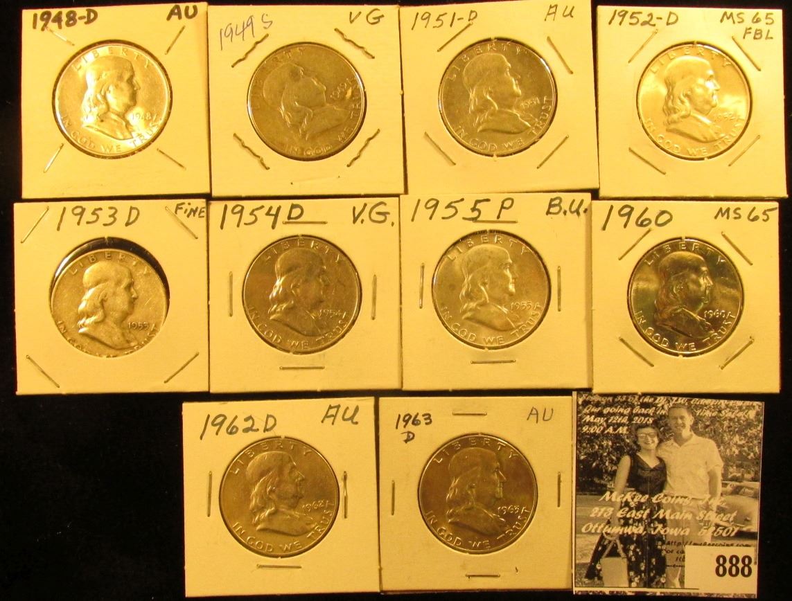1948 D AU, 49 S VG, 51 D AU, 52 D AU-BU, 53 D Fine, 54 D VG, 55 P BU, 60 P BU, 62 D EF, & 63 D AU Franklin Half Dollars.