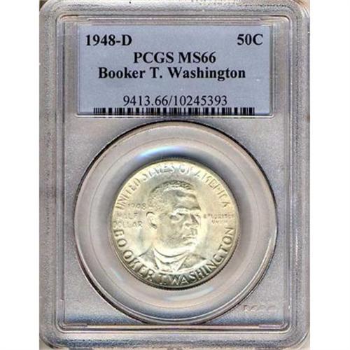 <b>1948-D Booker T. Washington Half Dollar. PCGS graded MS66.</b> The surfaces are highly lustrous and each side has pitching luster that swirls and alternates between lighter and darker hues <b>(PCGS # 9413)</b> <i>
