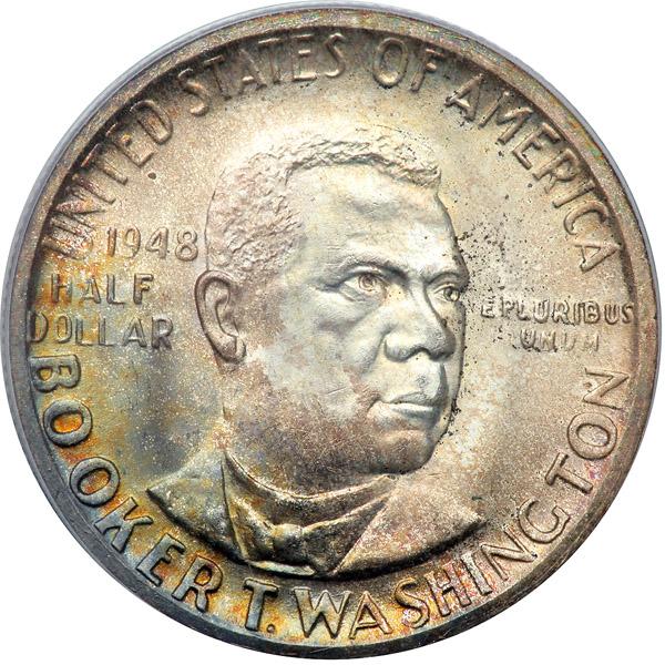 1948-D Booker T. Washington Half Dollar. PCGS graded MS-67 CAC Approved. Wonderful delicate pastel toning on the obverse. Pop 7; none finer (PCGS # 9413) .