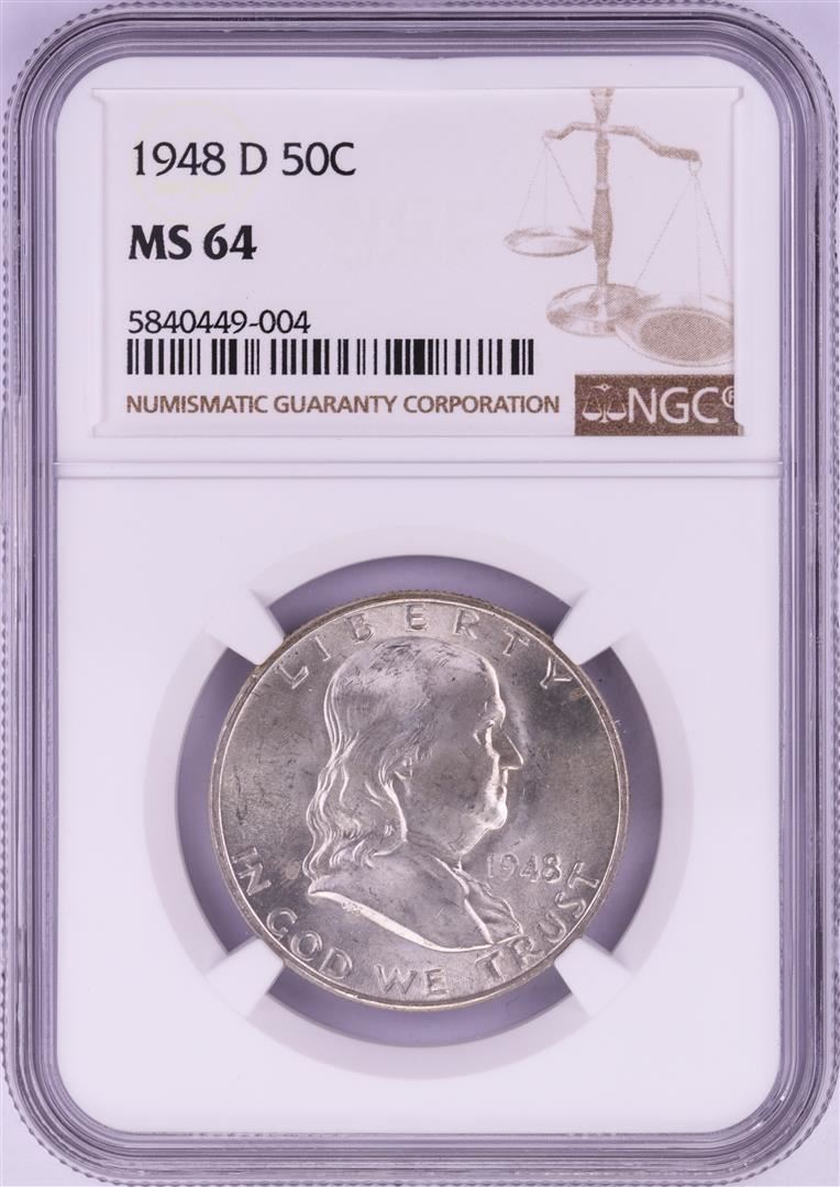 One 1948-D Franklin Half Dollar Coin NGC MS64. NGC Certified.