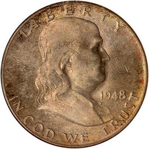 Smooth mint luster characterizes the surfaces on this lovely toned piece. It may have once been in a Mint Set which accounts for the fresh quality of the surfaces. (As a rule, '48-D halves picked from a roll are bagmarked.)