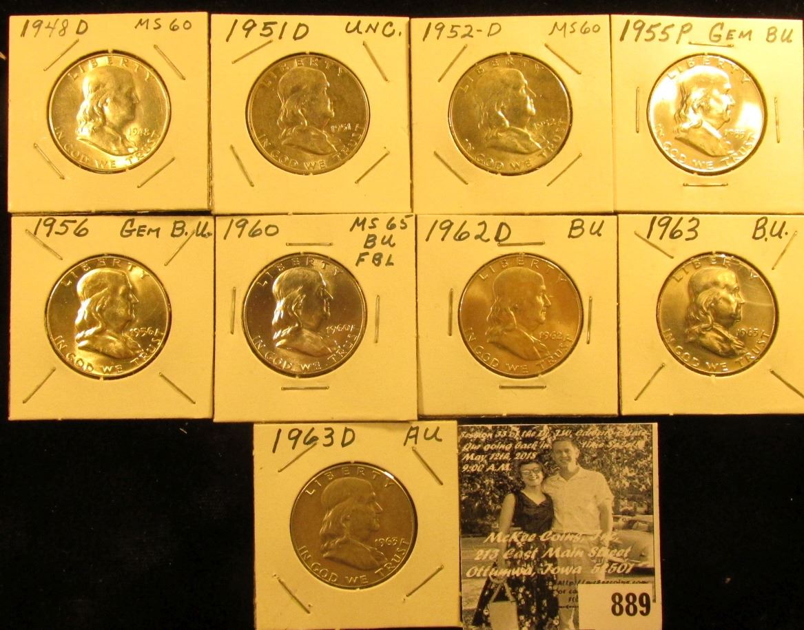 1948 D Unc, 51 D AU, 52 D Unc, 55 P BU, 56 P BU, 60 P BU, 62 D BU, 63 P BU, & D AU Franklin Half Dollars.