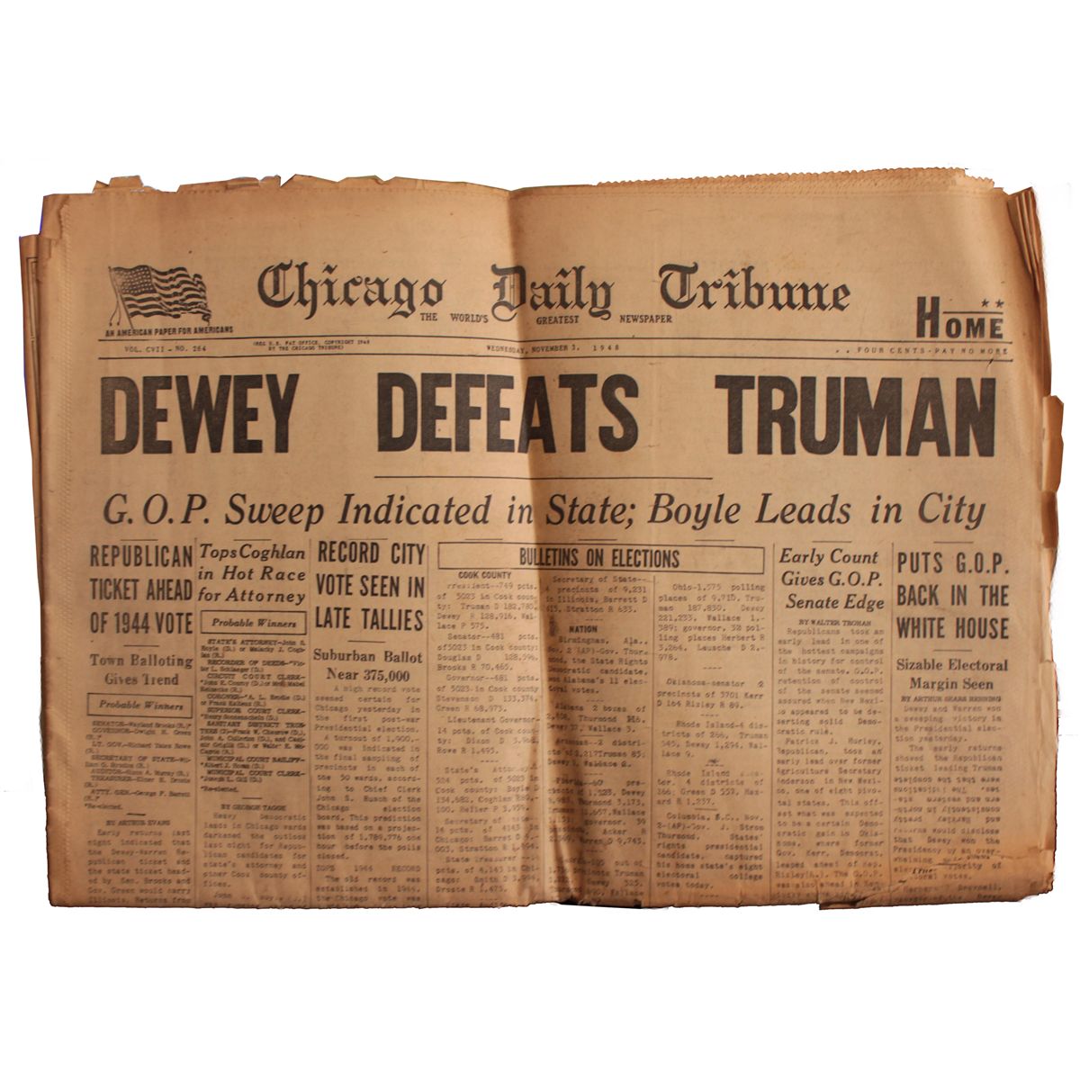 Chicago Daily Tribune Home edition from 3 November 1948, declaring the ultimate blooper, ''Dewey Defeats Truman''. In the rush to get the paper printed, the typeface was even printed upside down on parts of the second page. Front page ''Bulletins on Elections'' detail numbers of votes for each candidate in precincts reported; other headlines in 26 page newspaper include ''Early Count Gives G.O.P. Senate Edge'' and ''Republican Ticket Ahead of 1944 Vote.'' Moderate toning to 16.75'' x 23'' paper and tear along center fold. Overall very good.