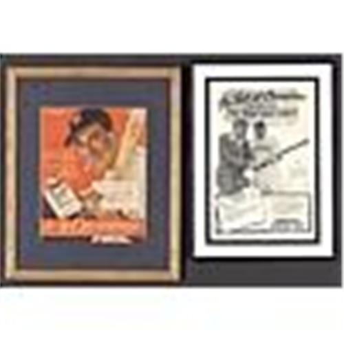 Pair of Chesterfield paper advertisements released in conjunction with the 1948 William Bendix film "The Babe Ruth Story." One pictures William Bendix and the other pictures Bendix and Babe Ruth showing the actor how he gripped the baseball bat. Matted and framed to 17-1/2" x 21-1/2" and 15" x 20", respectively. Both appear to be in EXMT condition with light wear.