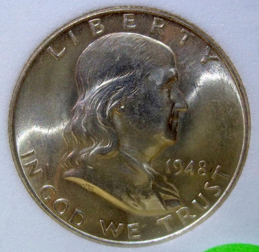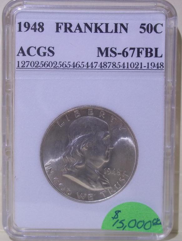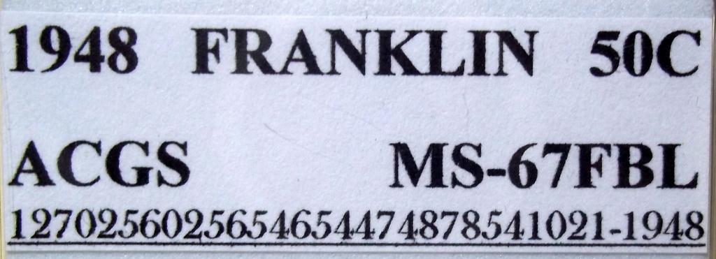 Extraordinary 1948 Philadelphia Mint Franklin Half Dollar, certified and graded Mint State 67 Full Bell Lines by ACGS! Full Bell Line Franklin Half Dollars are the MOST prized examples of the series. This is a first year of issue coin with a needle sharp strike. You may never get this chance again!