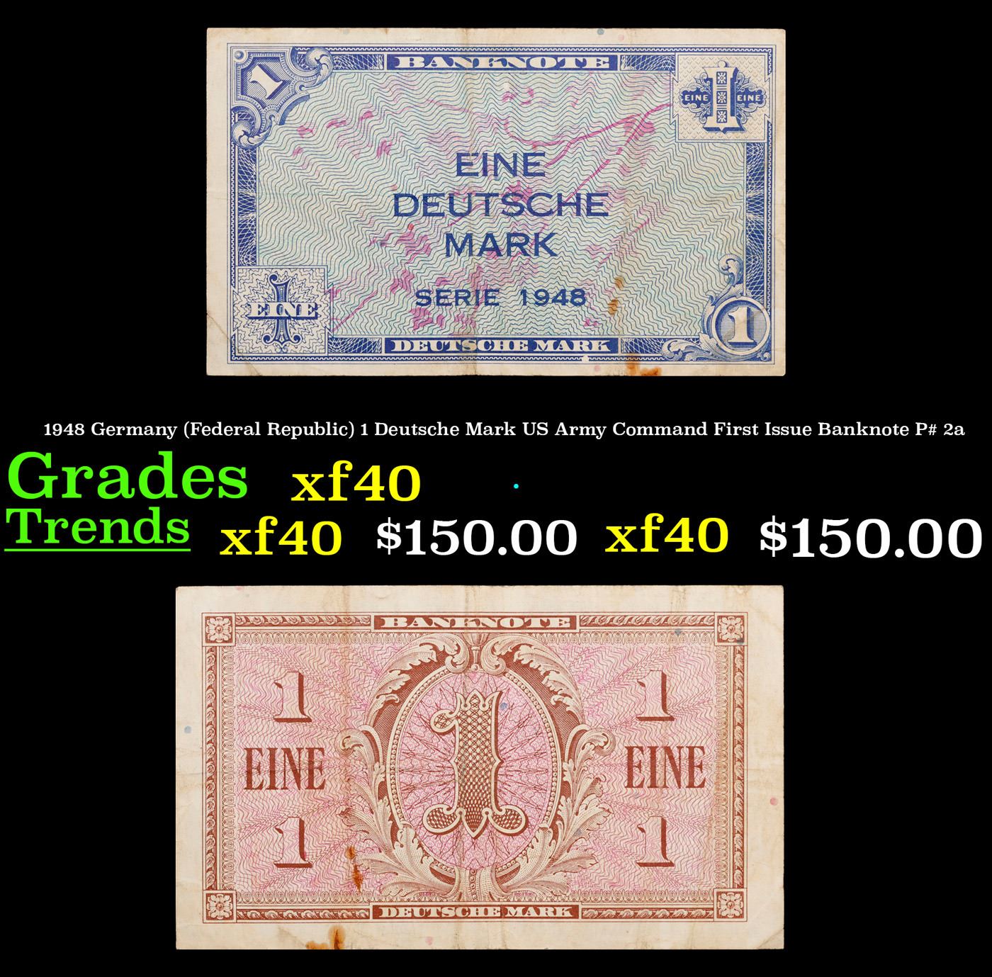 1948 Germany (Federal Republic) 1 Deutsche Mark US Army Command First Issue Banknote P# 2a Grades xf. Circulated by the United States Army Command, this was the first of three 1948 issues of West German currency.