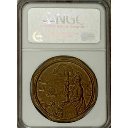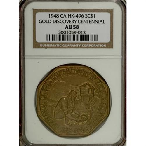 <B>1948 Gold Discovery Centennial Bronze Octagonal So-Called Dollar AU58 NGC.</B></I> HK-496. Bronze, size 25 x 25. Hibler-Kappen notes a slight irony regarding this issue, in that many of the HK-496 bronze pieces were gold-plated, making them closer in appearance to the HK-497 gilt items, but the HK-496 is the more desirable variant today. Struck by Irvine & Jachens on behalf of the California Medallists Society.<BR><I>From The Jankovsky Collection of California Slug Facsimiles.</B></I><BR><BR><b>Shipping:</b> Coins & Currency (<a target="_blank" href="http://www.heritageauctions.com/common/shipping.php">view shipping information</a>)