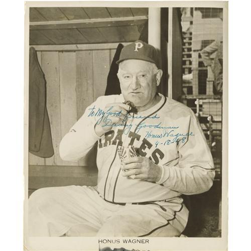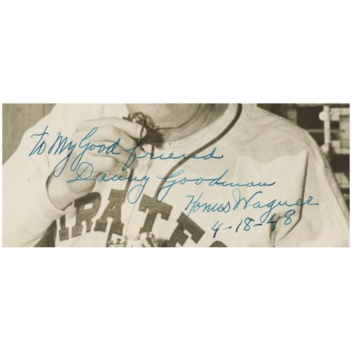<B>1948 Honus Wagner Signed Photograph.</B></I> If the widely held belief that Wagner removed himself from the T206 set due to his opposition to tobacco is true, the Old Dutchman clearly had a change of heart in his later years. Here he prepares to enjoy a chew in the uniform of a team he first represented almost a half century earlier. A simply unimprovable inscription to a noted Dodgers executive decorates Wagner's chest, reading, "To My Good friend Danny Goodman, Honus Wagner, 4-18-48." A small amount of ink staining at the lower border causes no concern and remains the only condition issue of note. Size is 8x10". Consigned by the same Goodman family member who submitted the 1948 Babe Ruth signed photograph to this auction. <I>LOA from PSA/DNA. LOA from James Spence Authentication.</B></I><BR><BR><b>Shipping:</b> Small Flat (<a target="_blank" href="http://www.heritageauctions.com/common/shipping.php">view shipping information</a>)