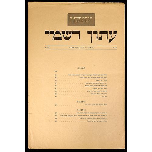 <Our item number 140259><B>1948 Israeli Government Organizational Paper.</B> Printed document, formal paper, 11pp, in Hebrew, Tel Aviv, 21 July 1948. Four pages measure 13 x 8½ in., seven pages measure 10 x 7 in. Just months after independence, Israel organizes its government. Table of Contents reads: "State of Israel, Formal paper, Temporally assigned government, #10, 1 Tel Aviv 14th of Tamuz 07-21-1948, pg 55, Table of Contents: [pg] 56 An announcement in the matter of adding to the order of government and laws, 1948. [pg] 56 An announcement in the matter of substitutes of the state's party members. [pg] 56 Appointing of officers [pg] 57 Appointing of a supervisor of transportation as an official authority. [pg] 57 Appointing of a supervisor of diamonds as an official authority. [pg] 57 Court orders. [pg] 58 Announcements of properties sales. [pg] 58 Announcements by the order of partnerships. [pg] 58 Correcting errors. Addition A [pg] 23 Budget orders (July 1948), Addition B [pg] 37 Order for supervision of foods. [pg] 39 Order of human resource recruitment (getting office employ's details, drivers, technicians) 1948 [pg] 39 Defense order (for supervising diamonds) (correction) 1948, [pg] 40 Meetings protocol of the temporary government. Fine condition with light edge wear. <BR>Estimated Value $800 - 1,000. <BR><BR>Our item number 140259<BR><IMAGES><P ALIGN="CENTER"><IMG SRC="http://www.goldbergcoins.net/liveauction/49jpegs/140259.jpg"> </P></IMAGES>