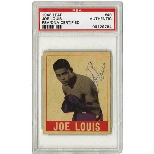 <B>1948 Leaf Joe Louis #48, Signed.</B></I> The most valuable card in boxing's most collectible trading card issue is made all the more inviting with the appearance of a 9/10 blue ballpoint ink autograph from the man described in the brief biography on verso as the "...greatest heavyweight of all time." The card itself shows mild toning and wear to three corners, but retains strong color and sharp registration that results in an impressive appearance. One of the very few trading cards of any sort we've seen with Louis' signature, and happily his most important one. Encapsulated by PSA/DNA for protection and unquestioned authenticity.